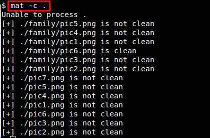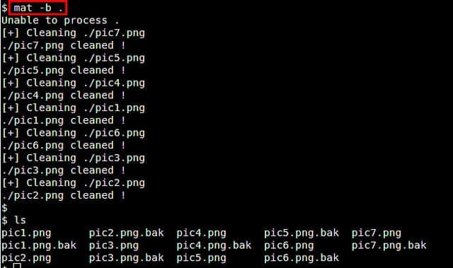 如果不为mat命令提供任何选项,默认操作会移除文件的元数据。如果要在清理的过程中保留原始文件的备份,使用“-b”选项。下面命令会清除所有文件的元数据,并将原始文件存储为“*.bak”文件。