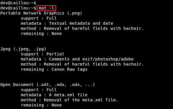 与诸如exiftool等只能对有限种类的文件类型进行写入的工具相比,MAT支持从各种各样的文件中消除元数据:图片(png、jpg)、文档(odt、docx、pptx、xlsx和pdf)、归档文件(tar、tar.bz2)和音频(mp3、ogg、flac)等。