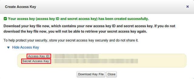 要么下载一个包含有新访问密钥的密钥文件,要么复制并粘贴新访问密钥信息。再次提请牢记,一旦你关闭该窗口,秘密访问密钥将不再可用,除非你下载一个密钥文件。