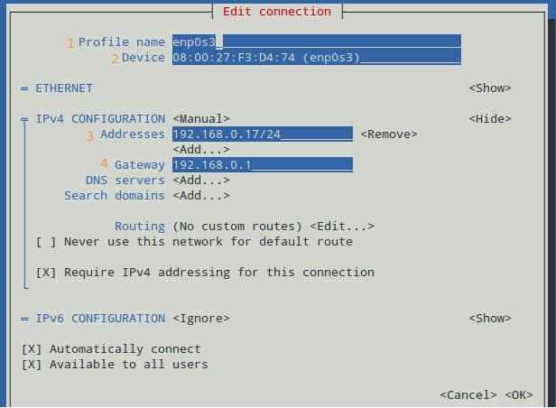 在下面的屏幕中,我们可以手动输入与/etc/sysconfig/network-scripts/ifcfg-enp0s3中所包含的内容相同的信息。
