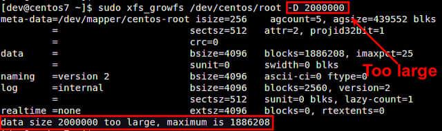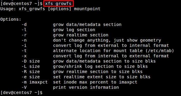 如果你不使用“-D”选项来指定大小,xfs_growfs将会自动扩展XFS文件系统到最大的可用大小。