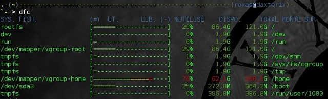 该命令可显示电脑上每一分卷的大小、 已使用空间、 可用空间、 已使用空间百分比和挂载点。 注意, 我们必须使用 "-h" 选项使得所有数据以可读形式显示(使用 GiB 而不是 KiB)。 但你可以使用 dfc 来完全替代 df, 它不需要任何额外的选项就可以得到 df 命令所显示的内容, 并且会为每个设备绘制彩色的使用情况图, 因此可读性会更强。