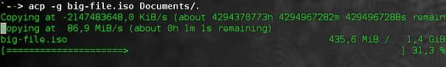 一个 Linux 中最基本的命令就是复制命令: cp。 它几乎和 cd 命令地位相同。 然而, 它的输出非常少。 你可以使用 verbose 模式来实时查看正在被复制的文件, 但如果一个文件非常大的话, 你看着屏幕等待却完全不知道后台在干什么。 一个简单的解决方法是加上一个进度条: 这正是 advcp (advanced cp 的缩写) 所做的! advcp 是 GNU coreutils 的一个 补丁版本, 它提供了 acp 和 amv 命令, 即"高级"的 cp 和 mv 命令. 使用语法如下: