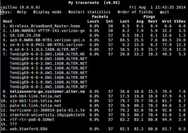 系统管理员的一个基本的网络诊断工具traceroute可以用于显示从本地网络到目标网络的网络第三层协议的路由。mtr(即“My Traceroute”的缩写)继承了强大的traceroute功能,并集成了 ping 的功能。当发现了一个完整的路由时,mtr会显示所有的中继节点的 ping 延迟的统计数据,对网络延迟的定位非常有用。虽然也有其它的 traceroute的变体(如:tcptraceroute 或 traceroute-nanog),但是我相信 mtr 是traceroute 工具里面最实用的一个增强工具。