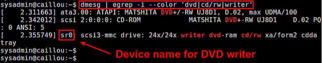 $ dmesg | egrep -i --color 'dvd|cd/rw|writer'
