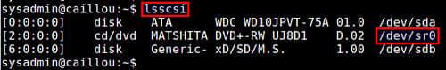 第二个获得你DVD刻录机的信息是使用lsscsi命令,它只是列出了所有可用的SCSI设备。