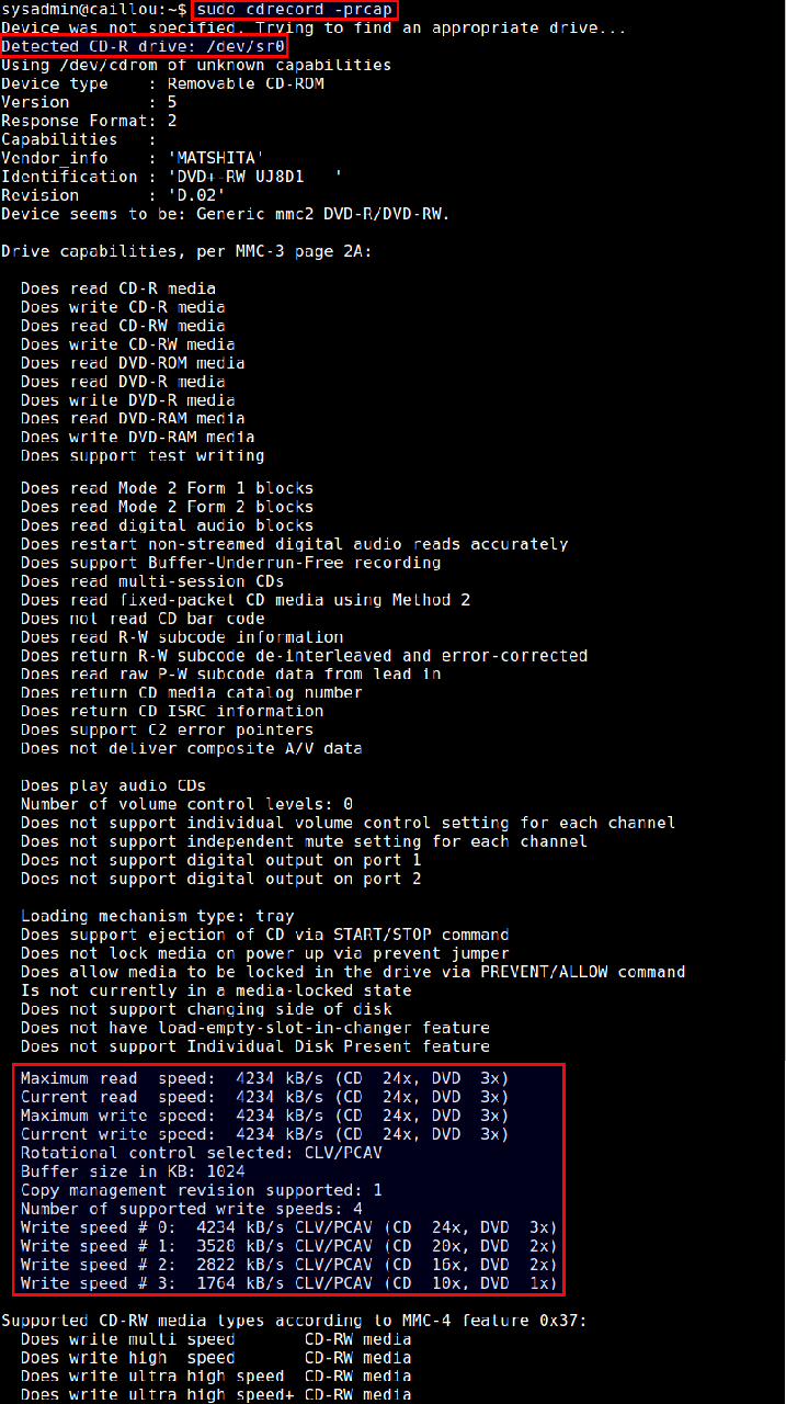 via: http://ask.xmodulo.com/detect-dvd-writer-device-name-writing-speed-command-line-linux.html