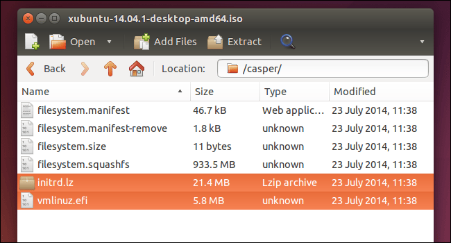 你可能需要查看ISO文件的内部来知道那些特定的的文件在哪里。例如,你可以通过使用Ubuntu及其它基于GNOME的桌面环境中的归档管理器/文件管理器这些图形化应用程序来打开ISO文件。在Nautilus文件管理器中,右击ISO文件并选择使用归档管理器打开。