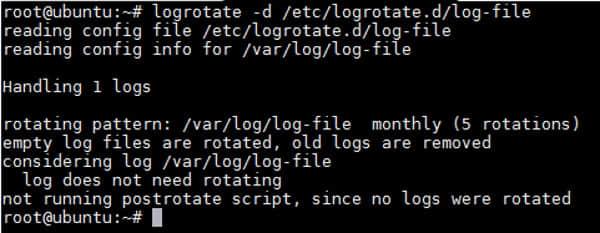 排障过程中的最佳选择是使用‘-d’选项以预演方式运行logrotate。要进行验证,不用实际轮循任何日志文件,可以模拟演练日志轮循并显示其输出。