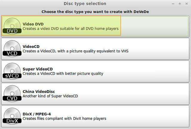 启动DeVeDe并从菜单选择视频DVD。