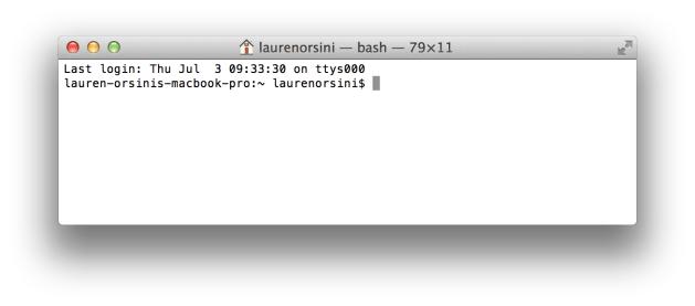 你需要做的第一件事是搞清楚如何进入命令行,通常这是通过一个叫“shell”的软件来做的。在任意一台运行OS X的Mac上,需要启动终端应用。你可以通过Finder来打开(它是在应用程序下的实用工具目录里),或者点击屏幕右上角的放大镜然后输入“terminal”,然后在下拉列表里选择。