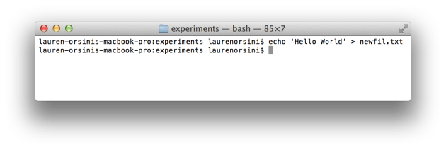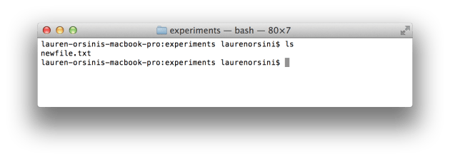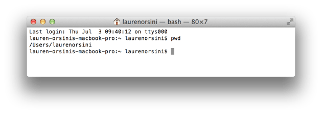 实际上,/Users/laurenorsini是我的主目录。高级提示:你可以使用波浪符(~)作为自己主目录的简写 - 它和/Users/你的用户名是一样的。比如,你可以像~/Downloads这样引用你的下载目录。(如果你仔细看前面的命令提示,你会发现那里有一个波浪符。这说明我当前正在自己的主目录下。)
