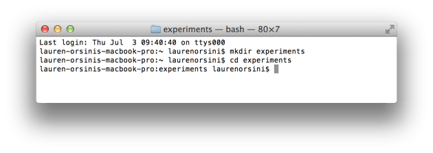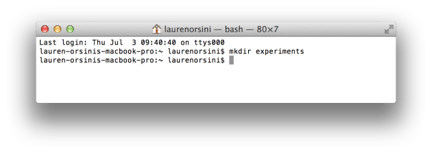我们肯定不希望我们的命令行试验把自己的主目录弄的一团糟,所以让我通过mkdir命令来创建一个新目录。这和在桌面操作系统里创建一个新目录是一样的。让我们把它叫做“experiments”: