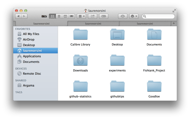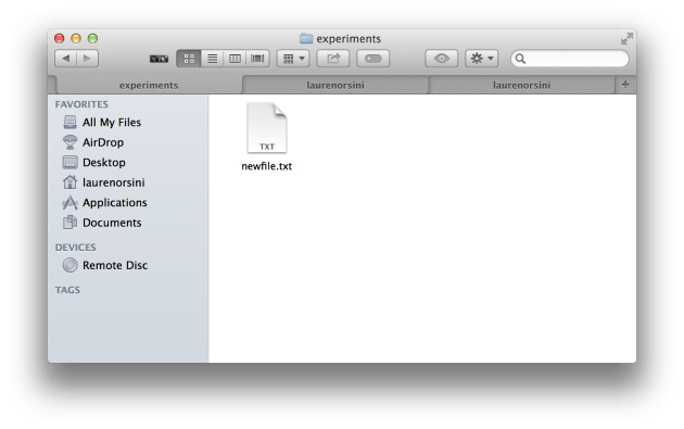 现在我们有一个新目录了。如果使用图形界面的话,我们可以用自己的眼睛判断我们已经创建了一个新目录。当然,如果我打开Finder然后进入我的主目录(用一个小房子图标标记的)就会看到一个叫“experiments”的目录。我通过命令行实现的!(反过来:你可以在桌面系统里建立一个文件夹,然后在命令行下去查看。这只是同一套系统的两种不同表现方式。)