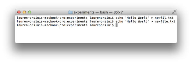现在你有一个新目录(也可以叫做仓库或文件夹)在你电脑上用来折腾。让我们从创建一个包含“你好世界”这句话的文件开始吧。有很多种方式,在这里我用了echo命令。
