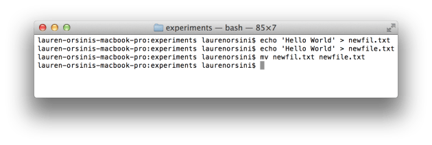 哦不!我拼错“newfile”了。这经常会碰到。让我们用两个步骤来改正它。首先,我将创建一个拼写正确的文件...(LCTT 译注:完全不必创建新文件,直接 mv 即可,相当于改名。)