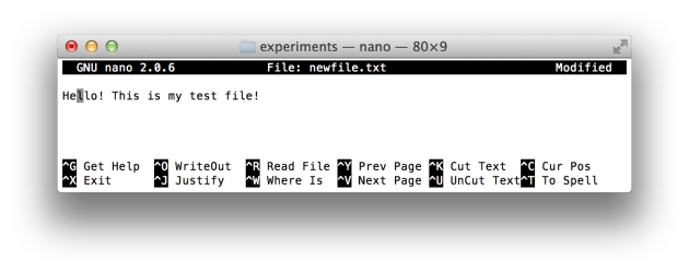 但是,它只是个空白文本文件(LCTT 译注,不是空白的,其内容是“Hello World”)。让我们用文本编辑器来输入点内容进去。在命令行下,我喜欢用nano编辑器,因为它很简单而且几乎在所有类型电脑上都可以使用。(LCTT 译注,作为 Linux 党,那肯定是要用 vi 的,不过 vi 对于初学者来说有一点点难。)
