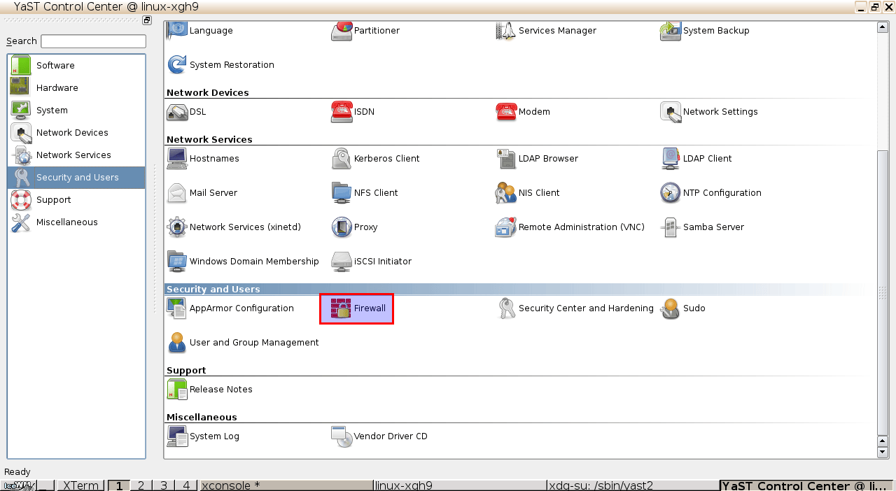 首先,在菜单中打开YaST控制中心。选择Security and Users(安全和用户) -> Firewall(防火墙)