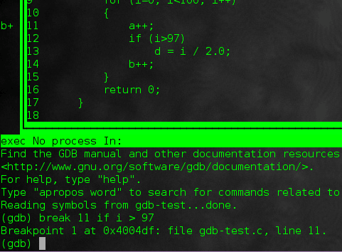 现在我们可以在程序的任何地方设置断点。你可以通过下列命令来为当前源文件的某一行设置断点。