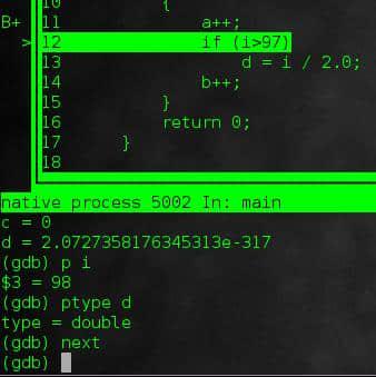 使用”-tui“选项可以将代码显示在一个漂亮的交互式窗口内(所以被称为“文本用户界面 TUI”),在这个窗口内可以使用光标来操控,同时在下面的GDB shell中输入命令。