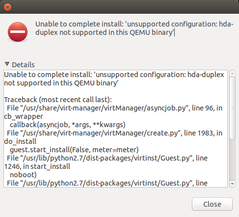 无法完成安装:‘不支持的配置:hda-duplex在此QEMU文件中不支持’