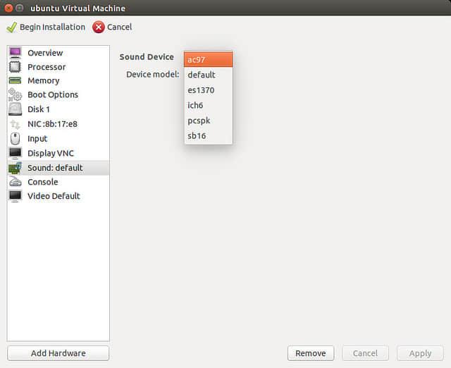 如果你使用的是virsh 而不是virt-manager, 你可以编辑VM相应的配置文件。在节点中查找sound节点,并按照下面的默认声卡型号改成ac97。