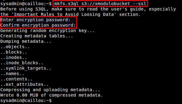 使用 mkfs.s3ql 工具来创建一个新的 S3QL 文件系统。这个命令中的 bucket 名应该与 authinfo2 文件中所指定的相符。使用“--ssl”参数将强制使用 SSL 连接到后端存储服务器。默认情况下,mkfs.s3ql 命令会在 S3QL 文件系统中启用压缩和加密。
