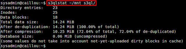 若要查看 S3QL 文件系统统计信息,你可以使用 s3qlstat 命令,它将会显示诸如总的数据、元数据大小、重复文件删除率和压缩率等信息。
