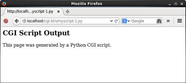 #!/usr/bin/python print "Content-Type: text/html" print "" print "<html>" print "<h2>CGI Script Output</h2>" print "<p>This page was generated by a Python CGI script.</p>" print "</html>"