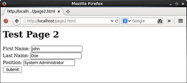 对于这个方案,我们将通过创建一个含有三个输入域和一个提交按钮的网页/var/www/html/page2.html开始。