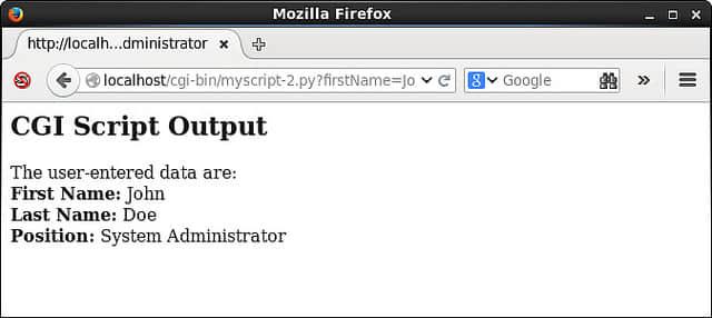 #!/usr/bin/python import cgi form = cgi.FieldStorage() print "Content-Type: text/html" print "" print "<html>" print "<h2>CGI Script Output</h2>" print "<p>" print "The user entered data are:<br>" print "<b>First Name:</b> " + form["firstName"].value + "<br>" print "<b>Last Name:</b> " + form["lastName"].value + "<br>" print "<b>Position:</b> " + form["position"].value + "<br>" print "</p>" print "</html>"