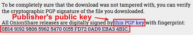 本例中我会验证一个从 https://onionshare.org 上下载的磁盘镜像。这个网站中,发行商会提供他们的公钥,还有它用于密钥验证的指纹。