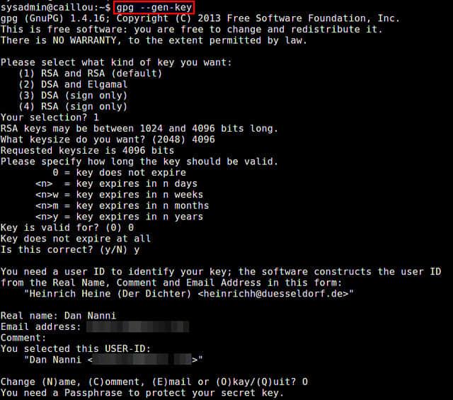 在生成键对期间,你会被要求提供你的姓名和email,还有保护你私钥的密码。你同样也可以选择键对何时过期(默认不会过期)。依赖于你选择的key的大小(在1024和4096位之间),key生成会花上几分钟或者更多,同时它要求收集来自你桌面活动的大量的随机数据。(比如键盘输入、鼠标移动、磁盘访问等等,所以这个时候随便动动鼠标键盘什么的)。