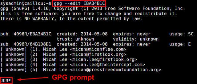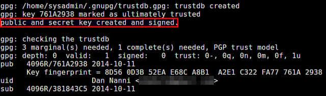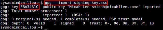 一旦拥有者的公钥导入后,他会像下面那样打印出一个key ID(比如:"EBA34B1C")。记住这个key ID。