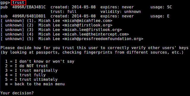 在GPG提示符中输入“trust”,它会让你从1-5之间选择这个key的信任等级。