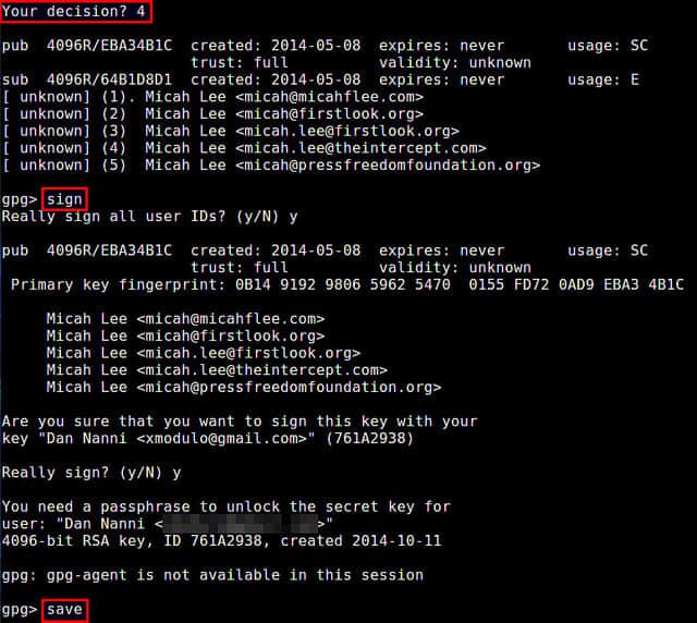 本例中,我决定分配给它“4”,在这之后,输入“sign”用你自己的私钥签名,接着输入在GPG提示符中输入“save”来完成操作。