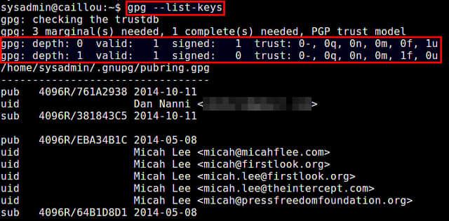 你至少会看到两个key:一个带 depth 0和终极信任("1u"),这就是你自己的key,另外一个带depth 1和完全信任("1f"),这是你之前签名的key。