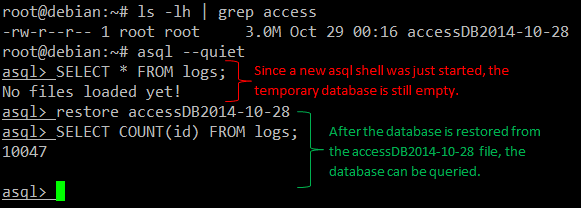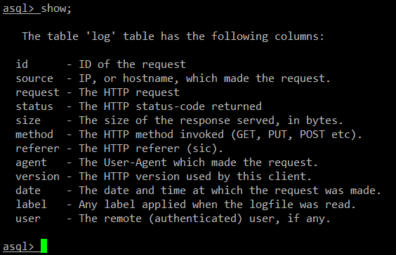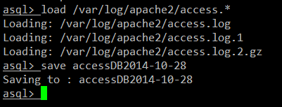 当 asql 完成对 access 日志的加载后,我们就可以开始数据库查询了。注意一下,加载后生成的数据库是 "temporary" (临时)的,意思就是数据库会在你退出 asql 的时候被清除。如果你想要保留数据库,你必须先将其保存为一个文件。我们会在后面介绍如何这么做(参考 example 3 和 4)。