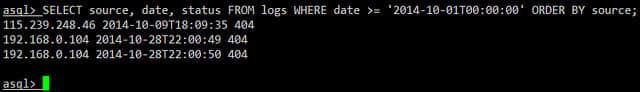 SELECT source, date, status FROM logs WHERE date >= '2014-10-01T00:00:00' ORDER BY source;