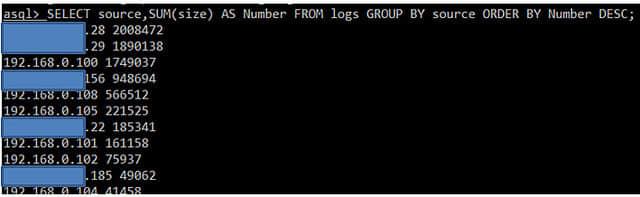 SELECT source, SUM(size), AS NUMBER FROM logs GROUP BY source ORDER BY Number DESC;