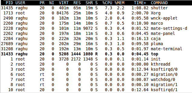 作为一个广为人知的Linux工具,top是大多数的类Unix操作系统任务管理器。它可以显示当前正在运行的进程的列表,用户可以按照不同的条件对该列表进行排序。它主要显示了系统进程对CPU和内存的使用状况。top可以快速检查是哪个或哪几个进程挂起了你的系统。你可以在这里看到top使用的例子。 你可以在终端输入top来运行它并进入到交互模式: