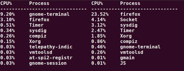 # sysdig proc.name=vim # sysdig -p"%proc.name %fd.name" "evt.type=accept and proc.name!=httpd" # sysdig evt.type=chdir and user.name=root # sysdig -l # sysdig -L # sysdig -c topprocs_net # sysdig -c fdcount_by fd.sport "evt.type=accept" # sysdig -p"%proc.name %fd.name" "evt.type=accept and proc.name!=httpd" # sysdig -c topprocs_file # sysdig -c fdcount_by proc.name "fd.type=file" # sysdig -p "%12user.name %6proc.pid %12proc.name %3fd.num %fd.typechar %fd.name" evt.type=open # sysdig -c topprocs_cpu # sysdig -c topprocs_cpu evt.cpu=0 # sysdig -p"%evt.arg.path" "evt.type=chdir and user.name=root" # sysdig evt.type=open and fd.name contains /etc