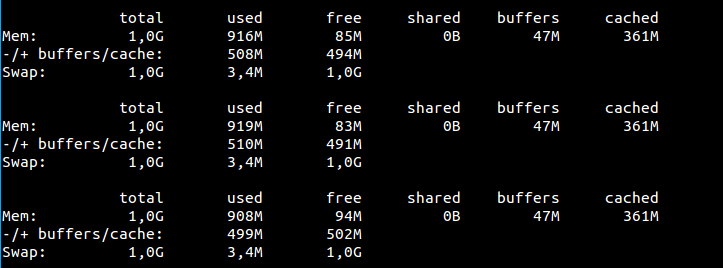 free是另一个能够在终端中显示内存和交换空间使用的命令行工具。由于它的简易,它经常用于快速查看内存使用或者是应用于不同的脚本和应用程序中。在这里你可以看到这个小程序的许多应用。几乎所有的系统管理员日常都会用这个工具。:-)