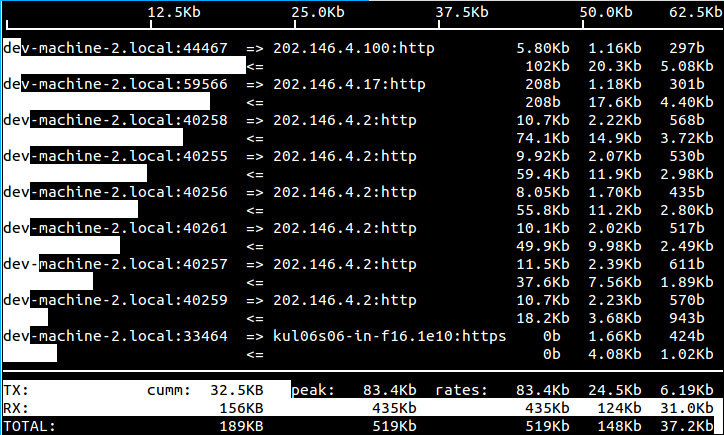 iftop是另一个基于网络信息的类似top的程序。它能够显示当前时刻按照带宽使用量或者上传或者下载量排序的网络连接状况。它同时提供了下载文件的预估完成时间。