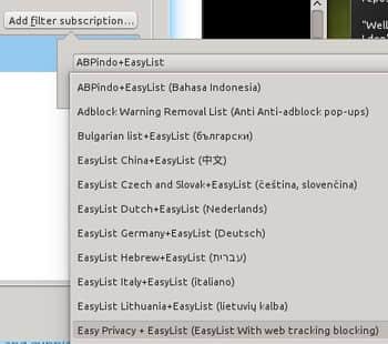 Ad Blocker们不仅能屏蔽广告;它们还能屏蔽网站跟踪爬虫与恶意域名。要打开额外过滤规则,点击ad blocker图标 > 点击首选项,转至过滤规则订阅标签。点击按纽添加订阅过滤规则,然后加入Easy Privacy + EasyList规则。加入恶意域名过滤也是个不错的选择;它会屏蔽那些供恶意软件与间谍软件寄生的域名。Adblock可在Firefox, Chrome, Opera, Safari, IE, 以及Android平台下工作。