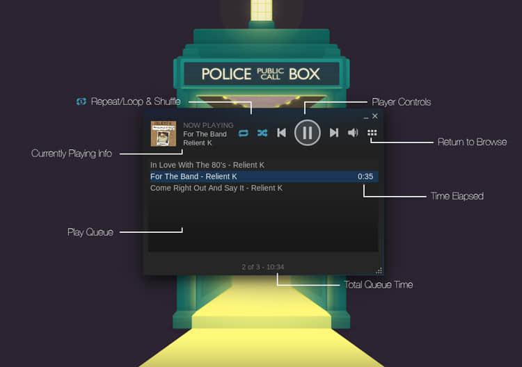 任何使用最新版客户端的人都能使用Steam Music音乐播放器。它是个相当简单的附加程序:它让你能从你的电脑中添加、浏览并播放音乐。