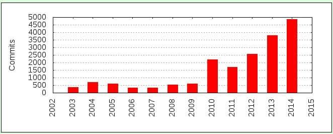 在2014年,Systemd 得到了 4879 个提交,这要比2013年多28%,比2012年多91%。从最近的5000个提交来看,增加了418451行代码,并删除了203010行。