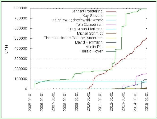 与其他主要成员如 Kay Sievers 和 Tom Gundersen 表现平平相比,Lennart Poettering 这一年一个人就提交了一大堆代码,他以1767个提交荣膺今年的 systemd 开发者的 No.1。其它的主要开发者还有: Tom Gundersen, Zbigniew JÄ™drzejewski-Szmek, Kay Sievers, David Herrmann, 和 Thomas Hindoe Paaboel Andersen.
