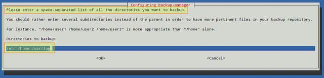 在下一步中,会询问你要备份的所有目录(用空格分隔)。建议,但不是严格要求,列出同一父目录中的几个子目录,而不要仅仅输入父目录。