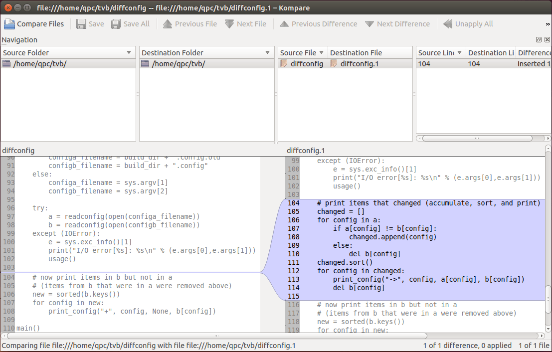 Kompare是个开源的GUI前端程序,可以对不同源文件之间差异的可视化和合并。Kompare可以比较文件或文件夹内容的差异。Kompare支持很多种diff格式,并提供各种选项来设置显示的信息级别。